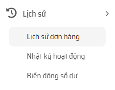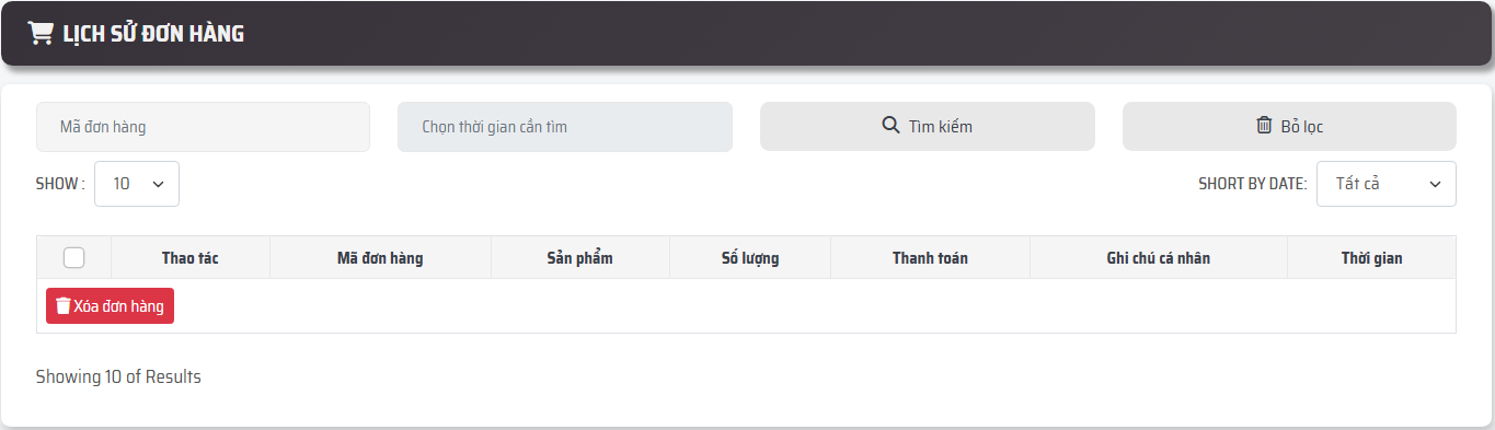 2. Trong lịch sử đơn hàng. Phần đầu sẽ có các box dùng để tìm và lọc danh sách đơn hàng, phần sau sẽ là danh sách đơn hàng bao gồm các cột: