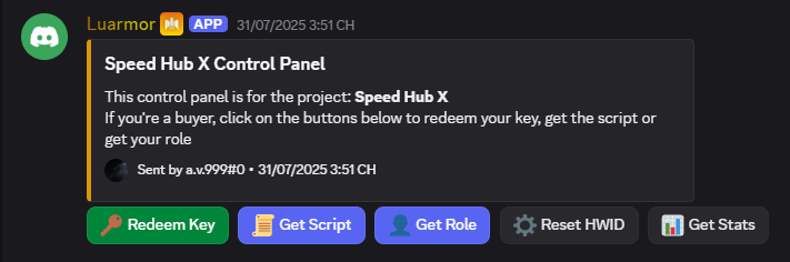 9. Sau khi redeem thành công. Để lấy script hãy nhấn nút Get Script sau đó bot Luarmor sẽ gửi script lên chat để bạn copy và sử dụng (Chỉ bạn mới nhìn thấy).