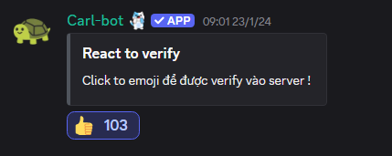 2. Truy cập vào kênh #verify. Sau đó bạn sẽ thấy 1 đoạn chat có ghi "Click to emoji để được verify vào server !". Đợi 10 phút để discord mở khoá tương tác sau đó nhấn vào icon👍ở cạnh một đoạn số dài hiện ở bên dưới đoạn chat để verify.